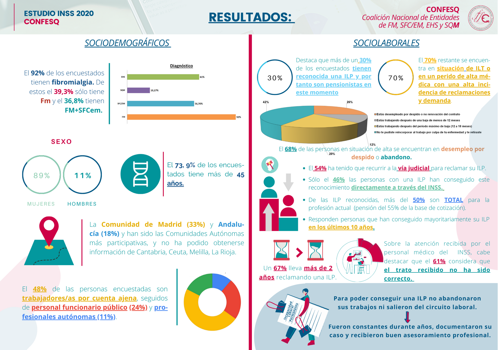 En las siguientes fotografías se exponen las principales conclusiones del estudio que a realizado CONFESQ (Coalición Nacional de Fibromialgia, SFC y SSQM) en cuanto al INSS (Instituto Nacional de la Seguridad Social) y su atención al colectivo